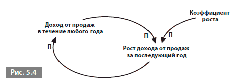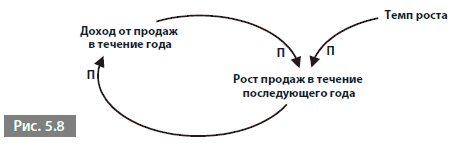 Звенья скорости объясняют, почему петли могут демонстрировать не только рост, но и упадок: все зависит от того, имеет усиливающая петля положительное или отрицательное число. Пример, относящийся к бизнесу, см. на рис. 5.8. Если темп роста выражен положительным числом, рост продаж в последующий год также будет положительным, и доход от продаж тоже будет расти с каждым витком петли.
