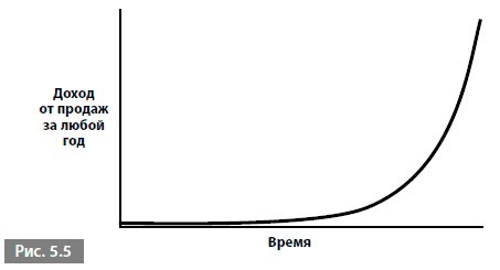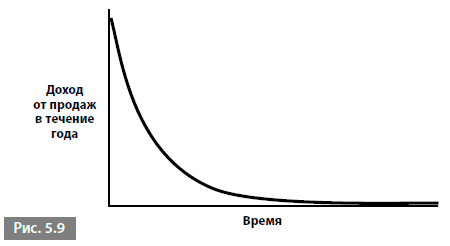 Однако если темп роста выражен отрицательным числом, рост продаж в течение последующего года также становится отрицательным, и доход от продаж сокращается, создавая порочный круг экспоненциального спада (рис. 5.9).