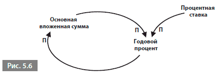 Эта схема роста имеет свое название: экспоненциальный рост. Такую схему демонстрируют все усиливающие петли. Вот такая же схема на примере сложного процента (рис. 5.6).