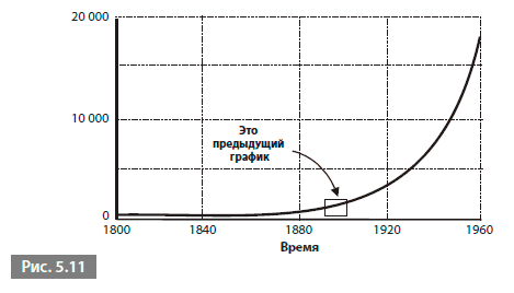 Это, конечно, экспоненциальный график. Однако если взять достаточно маленький его фрагмент, он может казаться линейным. Поэтому будьте осторожны, интерпретируя поведение на основе малого количества данных, особенно если изучаемая система работает сравнительно давно: то, что вы увидите с первого взгляда, может оказаться ошибочным. Экспоненциальный рост всегда начинается очень медленно, и может пройти некоторое время, прежде чем он станет очевидным.
