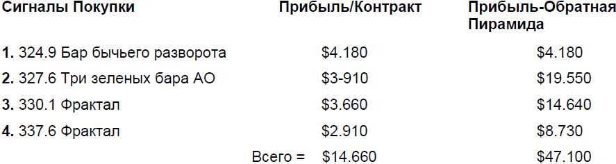 Этот список является хорошим примером того, что может произойти с единственным фьючерсным контрактом или акцией за период в приблизительно шесть недель. Позднее в этой главе мы объясним, как используем обратную пирамиду для увеличения и общей, и процентной прибыли. На протяжении многих лет мы нередко заявляли, что после того, как вы станете прибыльным трейдером, мы можем показать вам, как по меньшей мере удвоить вашу прибыль, используя те же самые сигналы, за счет простого распределения активов. В случае с золотом мы обычно ограничиваем нашу инвестицию 15 контрактами, что позволяет нам использовать обратную пирамиду. В данном случае это увеличило нашу прибыль в 3,2 раза, хотя мы и не использовали пятый вход на рынок. Обратная пирамида описывается в данной главе далее.