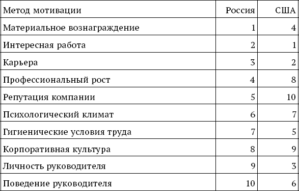 Таблица 6. Ранжирование сотрудниками компаний методов мотивации в России и США
