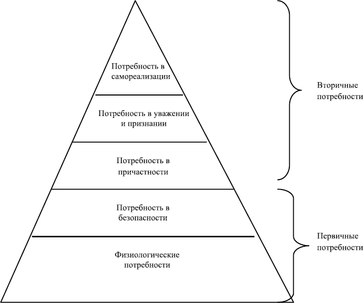 Первым подробную классификацию потребностей дал американский ученый Абрахам Маслоу, который построил их пирамиду (рис. 28). Он выделил пять групп потребностей, разделенных на первичные (физиологические и потребности в безопасности) и вторичные (потребности в причастности, уважении и самореализации).