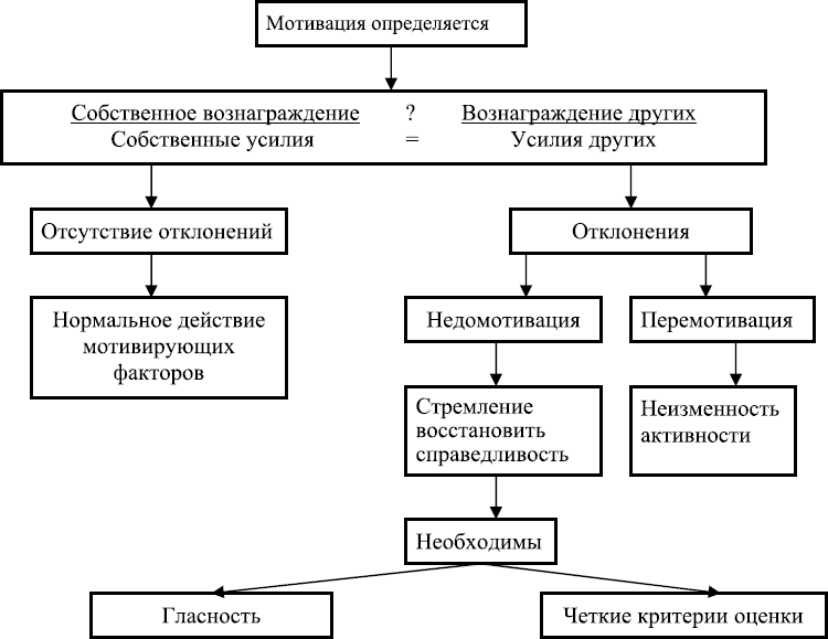 Теория справедливости С. Адамса (рис. 30) исходит из того, что человек постоянно сравнивает то, как были оценены его действия, с тем, как были оценены действия других, и в зависимости от полученного результата чувствует себя удовлетворенным или обиженным. При этом следует иметь в виду, что, признавая вознаграждение вполне соответствующим затратам его труда, человек все равно будет недоволен, если он считает, что кто-то другой за аналогичную работу получает более высокую плату.