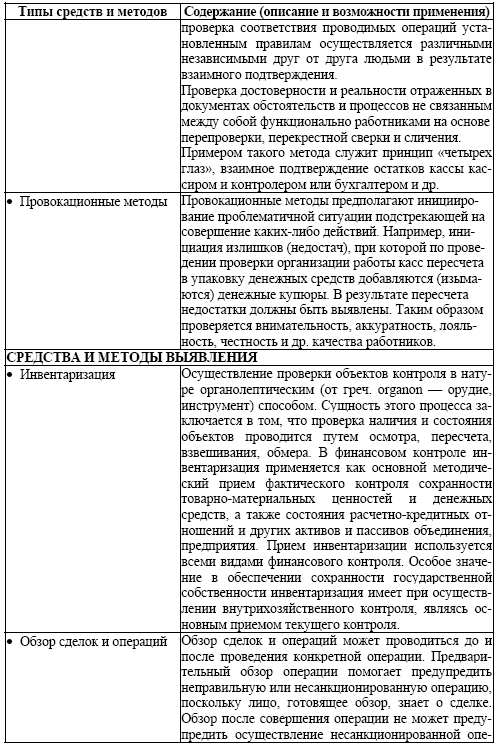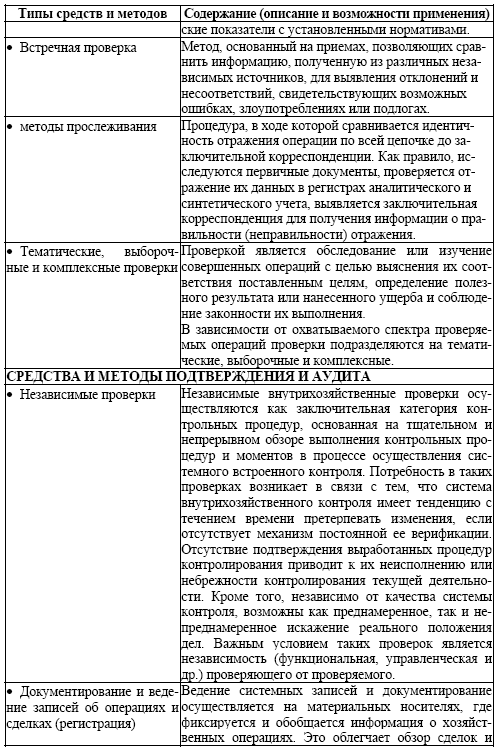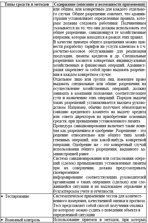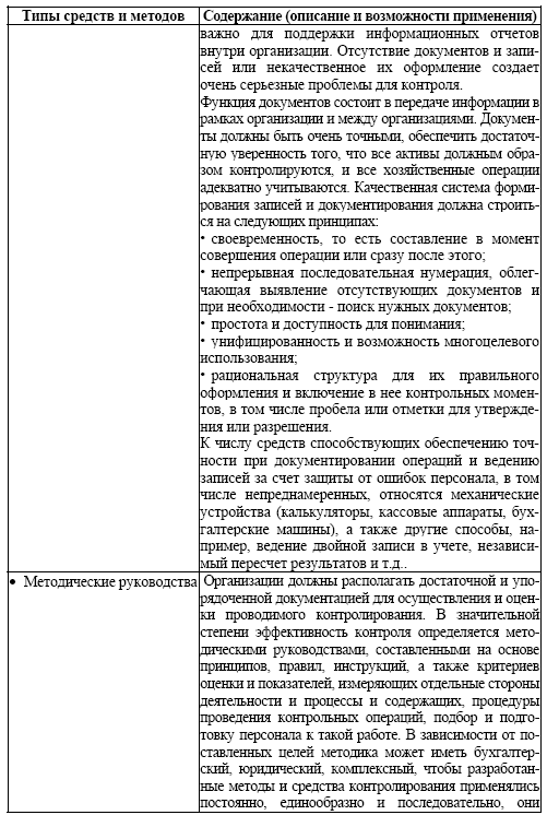 Способы, методы и процедуры проведения контроля непрерывно развиваются и совершенствуются с тем, чтобы постоянно и полно соответствовать изменяющимся хозяйственным условиям, минимизировать ошибки в деятельности, быть экономичными. Кроме того, встраивание контролирования в технологический и управленческий процесс предполагает наряду с использованием традиционных приемов, расширением и модификацией действующих, выдвижение на первый план новых приемов, помогающих предотвратить существенные риски. Синтез различных приемов и методов позволяет разрабатывать действенные методики реализации контроля. Говоря о средствах и методах контроля, необходимо четко представлять их классификацию в зависимости от целевого использования и их эффективности в уменьшении риска возникновения существенных ошибок и злоупотреблений.