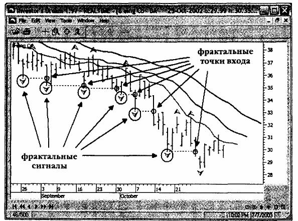 Дневной график Boeing Со. на Рисунке 11.8 показывает ряд последовательных действительных нисходящих фрактальных сигналов и их срабатываний в течение нисходящего тренда. Обратите внимание, что все фрактальные сигналы и места срабатывания каждого сигнала находятся значительно ниже Аллигатора. Каждый из этих фрактальных сигналов был возможностью увеличить вашу короткую позицию и в результате значительно повысить прибыльность этой сделки!