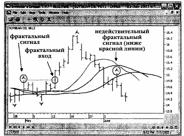 Идентифицировать действительные сигналы фракталов достаточно легко! На графике соевого масла, показанном на Рисунке 11.5, имеется пример действительного фрактального сигнала и последующего фрактального входа, а затем другого фрактала, который образуется внутри Аллигатора (ниже красной линии), и поэтому является недействительным в случае, если срабатывает. Цены упали ниже, и фрактальный сигнал не сработал.