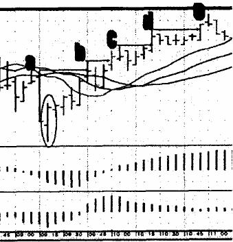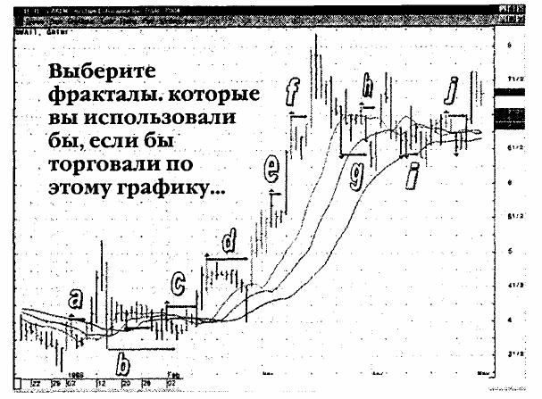 Рисунок 11.7 показывает различные фракталы, некоторые из которых следует использовать, а некоторые нет. Например, фракталы а, с, d, е и f являются хорошими сигналами этого начинающегося движения вверх. Фрактал b так и не сработал, а фракталы g, h и j не следовало использовать, потому что рынок явно перешел в коррекцию и стал ограниченным. Полное объяснение того, как торговать, используя волны Эллиотта, можно найти в нашей более ранней книге Trading Chaos (Wiley, 1994, стр. 101-132).