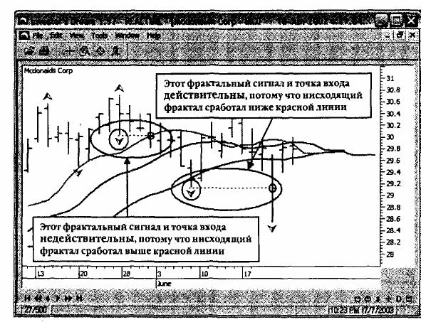 После того, как фрактальный сигнал сформирован и признается действительным относительно его положения за пределами пасти Аллигатора, он остается сигналом до тех пор, пока не срабатывает или пока не формируется новый фрактальный сигнал. Помните, что хотя фрактальная формация может сработать, она должна быть отфильтрована с помощью Аллигатора. Иными словами, вы не должны покупать, если фрактал находится ниже зубов Аллигатора, и вы не должны продавать, если фрактал находится выше зубов Аллигатора.