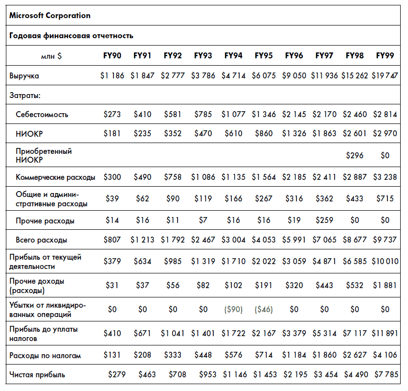 После первого выпуска акций финансовые результаты компании были просто поразительными. Выручка и прибыль компании росли ежегодно в среднем на 43 и 49 % соответственно. На 30 июня 1999 г. у компании скопилось денежных средств более чем на $17 млрд. Учитывая достаточно большую рискованность индустрии разработки программного обеспечения, результаты компании нельзя не назвать фантастическими. Вот финансовая отчетность компании за эти годы: