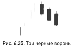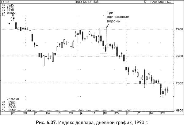 Другой пример трех черных ворон представлен на рисунке 6.37. Обратите внимание, что у второй и третьей черных свечей цены открытия почти совпадают с ценами закрытия предыдущих сессий. Такая модель называется три одинаковые вороны (identical three crows), она считается еще более сильным медвежьим сигналом, но встречается крайне редко.