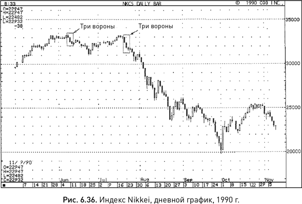 На рисунке 6.36 три черные вороны появились дважды: сначала в середине июня, а затем в середине июля. Последняя из этих моделей еще и представляла собой неудачную попытку прорвать уровень максимумов, достигнутых первыми тремя черными воронами вблизи отметки 33 000. В результате на графике сформировалась двойная вершина.