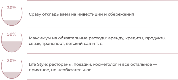 Тут попроще – всего три части. Придумала эту систему Алекса фон Тобель, основатель сервиса по планированию личных финансов LearnVest.