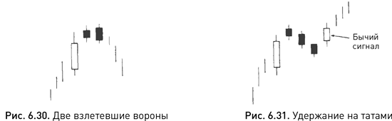 В модели две взлетевшие вороны, представленной на рисунке 6.30, слово «взлетевшие» означает гэп между маленьким телом первой черной свечи и телом предыдущей свечи, которое, как правило, является длинным и имеет белый свет. Черные свечи этой модели напоминают двух ворон, зловеще поглядывающих с ветки дерева, и нетрудно догадаться, что она имеет медвежий характер. В идеальной модели «две взлетевшие вороны» у второй черной свечи цена открытия должна быть выше, а цена закрытия – ниже, чем у первой.
