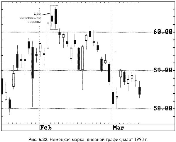 Рисунок 6.32 содержит удачный пример модели «две взлетевшие вороны», которая образовалась в начале февраля и поставила точку в ралли, начавшемся месяцем ранее.