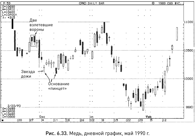 На рисунке 6.33 можно видеть, что повышение цен 27 ноября привело к образованию длинной белой свечи. Однако быки не смогли удержать локальные максимумы, достигнутые в течение двух следующих сессий, и с появлением второй черной свечи завершилось формирование модели «две взлетевшие вороны». После этого наблюдалось снижение, пока звезда дожи и основание «пинцет» не заложили основу для очередной волны роста.