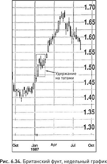 На рисунке 6.34 вы найдете классический пример удержания на татами. За длинной белой свечой с гэпом вверх возникла короткая черная, затем появились две черные свечи с еще более короткими телами, и, наконец, белая свеча, завершившая формирование модели. Еще раз обратите внимание на то, что удержание на татами не слишком отличается от двух взлетевших ворон (особенно если учитывать, что в нее могут входить только две черных свечи, а не три, как в данном примере). Ключевое отличие между ними – это наличие или отсутствие белой свечи после черных: именно она придает модели бычий либо медвежий характер. Поэтому при открытии короткой позиции на основании двух взлетевших ворон я советую устанавливать стоп-лосс чуть выше максимальной цены второй черной свечи.