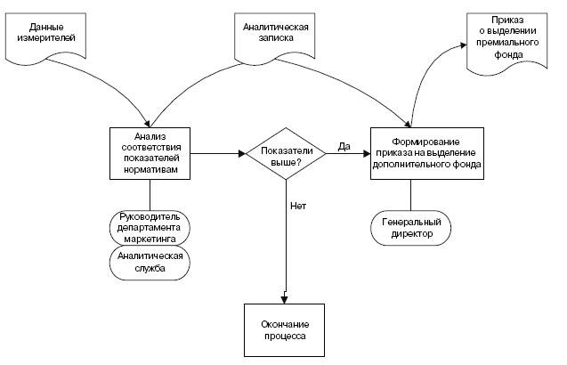 Управляющая компания финансирует локальное информационное вещание исходя из разработанных единых нормативов на производство и премиального фонда (за достижение аудиторных показателей). Премия выплачивается по итогам медиаисследований. Решение о премировании принимается генеральным директором. Бизнес-процесс такого премирования представлен на рис. 6.3.