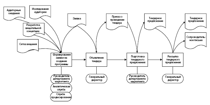 Если это локальная, городская программа, то ее производит местная ТРК. Если же программу размещают в сетке вещания нескольких городов, решение об этом принимают по итогам тендера (в данном случае бизнес-процесс аналогичен принятию решения по тендерным закупкам).