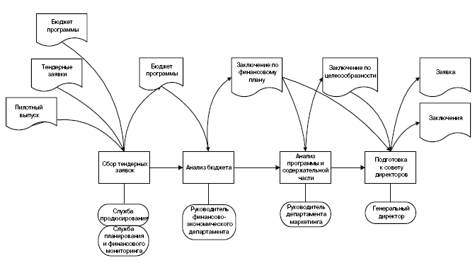 Стоимость программы определяется на основе производственных нормативов и гонорара творческой группы. При этом стоимость должна соответствовать ожидаемой зрительской аудитории. Бизнес-процессы сбора заявок и принятия решения изображены на рис. 6.5 и 6.6.
