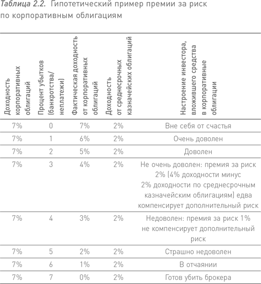 Взаимосвязь доходности и риска – самая важная концепция в этой книге. Даже если 10-летние корпоративные облигации приносят 7 %, что при условии ежегодного разорения 5 % компаний даст нам те же 2 % доходности, что и казначейские облигации, эти результаты не равноценны. Более того, они не идут ни в какое сравнение: корпоративные облигации лишают инвестора сна и аппетита, тогда как держатели казначейских облигаций спят как младенцы. Владельцам корпоративных облигаций необходима премия за риск, которая компенсирует им бессонные ночи и несварение желудка. Отсюда следует: чем больше риск, тем выше должна быть премия за риск.