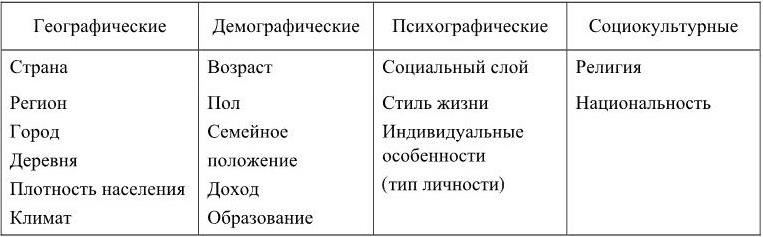 Например, Р. Мачадо в своей книге, «Маркетинг для малых предприятий» (Санкт-Петербург: изд-во Питер, 1998) предлагает сегментировать потребительский рынок используя четыре основные группы критериев:
