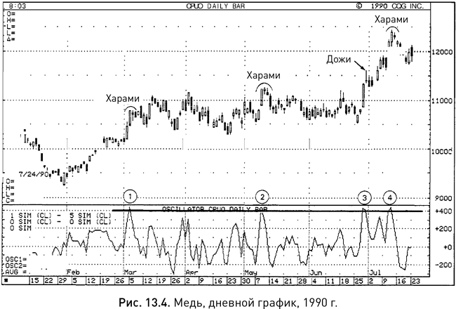 В качестве индикатора краткосрочной перекупленности или перепроданности некоторые аналитики сопоставляют текущую цену закрытия с пятидневной скользящей средней (см. рис. 13.4.) Например, если пятидневная скользящая средняя проходит на отметке $1,1, а цена закрытия составляет $1,14, значит медь перекуплена на $0,04. В данном примере дополнительный график в нижней части рисунка построен путем вычитания значений пятидневной скользящей средней из текущих цен. Как можно видеть на этом графике, в моменты, когда линия указанных скользящих средних поднимается до 400 пунктов (что соответствует $0,04), рынок становится уязвимым, и это подтверждается медвежьими сигналами свечей. В точке 1 указание на перекупленность дополнялось моделью «харами», эта же модель образовалась в точке 2, затем на отрезке 3 возникла дожи, а на отрезке 4 – опять харами. Выходом из состояния перекупленности может быть либо снижение цен, либо их переход в нейтральный торговый коридор. В данном случае перекупленность на отрезках 1 и 3 была снята переходом к боковому движению, а на отрезках 2 и 4 – последующим снижением. В условиях перекупленного рынка обычно не следует открывать короткие позиции, а вот обладателям длинных позиций стоит принять защитные меры. Обратное правило справедливо для рынка, который характеризуется как перепроданный.