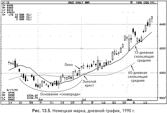 Обе скользящие средние могут наноситься непосредственно на график цены. Как отмечалось ранее, когда краткосрочная скользящая средняя пересекает долгосрочную снизу вверх, возникает бычий сигнал, называемый японцами «золотой крест». На рисунке 13.5 можно видеть как раз такой бычий сигнал, а также свечной индикатор «основание “сковорода”», который дополнительно был подтвержден открытием окна 2 июля. Обратите внимание, что в первой половине июля окно выступило в качестве уровня поддержки, а потом, по мере роста цен, эту же роль играла краткосрочная скользящая средняя.