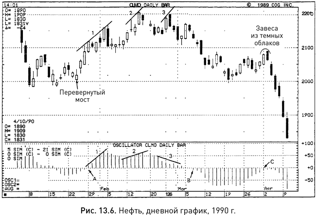 На рисунке 13.6 расхождение между двумя скользящими средними представлено в виде гистограммы. На отрезках 1 и 2 рост цен сопровождался повышением и на гистограмме, значит краткосрочная скользящая средняя росла быстрее долгосрочной, что предвещало продолжение восходящего тренда. На отрезке 3 быки столкнулись с проблемой. Подъем на $0,5, который начался 23 февраля, совпал с уменьшением разности между значениями скользящих средних, а это говорило об ослаблении краткосрочной восходящей тенденции. Добавьте к этому возникшую в этот момент завесу из темных облаков, и вы получите совокупность признаков, указывающих на возможность отката.