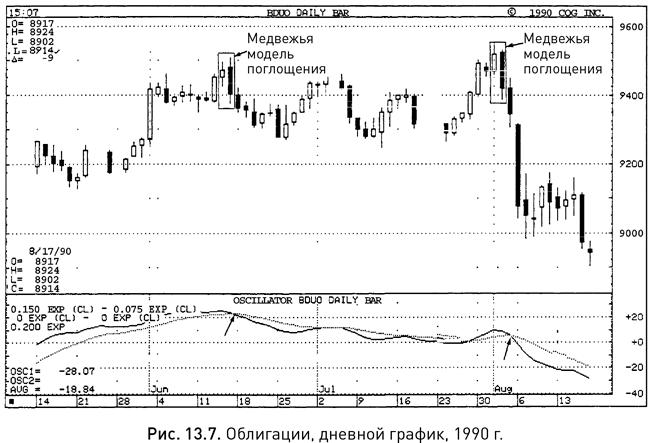 В нижней части рисунка 13.7 представлен график индикатора MACD, состоящего из двух линий. Более подвижная сплошная линия является сигнальной. Когда она пересекает сверху вниз более сглаженную пунктирную линию, возникает сигнал к продаже. Это и произошло в точках, помеченных стрелками, причем в обоих случаях в качестве подтверждения выступили медвежьи модели поглощения.