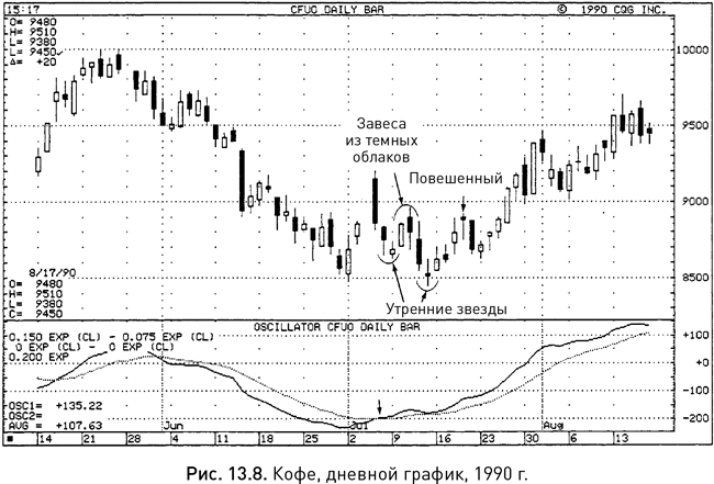 На рисунке 13.8 сигнальная линия MACD пересекла вверх вторую, более медленную, линию в начале июля – этот момент помечен стрелкой. Таким образом, можно было ожидать, что рынок достиг дна, тем более что на графике цены возникла модель «утренняя звезда». Сначала ее бычий сигнал был нивелирован завесой из темных облаков, но последовавшее за этим падение привело к появлению еще одной утренней звезды. В дальнейшем после небольшого отката, начавшегося с повешенного, рынок перешел к росту.