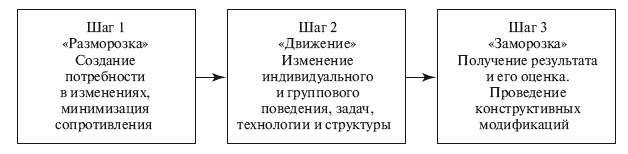 Следует отметить, что проблема организационных изменений в современном менеджменте является одной из ключевых. В разработку (анализ и моделирование) процесса организационных изменений значительный вклад внесли зарубежные и отечественные ученые К. Левин, Р. Липпит, Б. Санто, А.И. Пригожин, О. С. Виханский, А.И. Наумов и др. На рис. 15 представлена модель К. Левина для проведения организационных инноваций («трехшаговая модель изменений») [87, с. 582].
