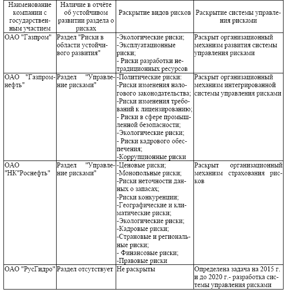 В условиях отсутствия единых требований к раскрытиям информации о рисках в отчётности был проведён анализ отчётов об устойчивом развитии нескольких государственных компаний. Отчётная информация была по-разному структурирована, но во всех отчётах содержала сведения о рисках деятельности компаний. Качественный анализ этой информации дал результаты, представленные в табл. 1.