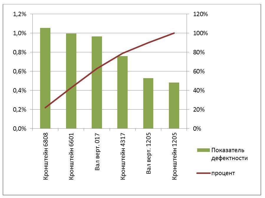 Доля бракованных изделий – это процент отношения количества забракованных изделий за период к количеству произведённых изделий по соответствующему потоку. Доля изделия в общем количестве номенклатуры изделий вычисляется как процент отношения количества соответствующих изделий к общему количеству реализуемых изделий. «Браконосный» поток вычисляется произведением соответствующей доли брака и доли изделия в общем количестве изделий, что мы называем показателем дефектности потока и ранжированием этого показателя. Все вышеперечисленные данные отражаются в таблице отбора (см. таблицу 8.10) и визуализируются диаграммой Парето (см. рисунок 8.11).