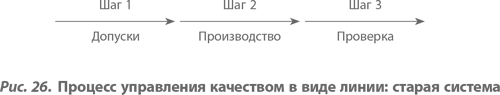Идея о цикличности пути улучшений предстает в работах Деминга в различных обличиях. Наиболее очевидной иллюстрацией служит диаграмма «производство, рассматриваемое как система», которую мы обсуждали в предыдущей главе. Все виды обратных связей целиком предназначены для проверки, изучения, а также соответствующих действий и планирования в целях дальнейших улучшений. Другой пример – диаграмма со стр. 168 «Выхода из кризиса», которая не просто подобна одному из ранее приведенных рисунков, взятому из книги Шухарта. На ней устаревший способ производства представлен в виде линии (см. рис. 32), а новый – в виде круга (см. рис. 33).