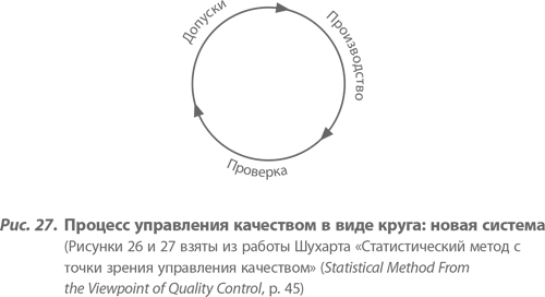Шухарт преобразовал прямую линию на рисунке 26 в окружность, которую отождествил с «динамическим процессом приобретения знаний». После первого же круга многое можно узнать из результатов контроля, дабы улучшить допуски на то, что на самом деле требуется. Производственный процесс корректируется соответствующим же образом, и новый выход из него контролируется. Это проясняет все еще желательные улучшения, и цикл продолжается.