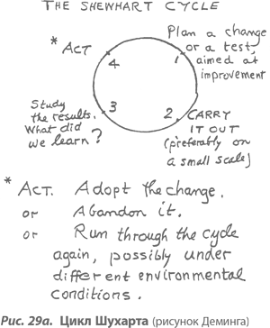 В настоящее время Деминг предпочитает использовать упрощенное представление цикла, включающее в качестве четвертого этапа «воздействуй». Рисунок 29 – это копия его собственной версии, которую он нарисовал во время семинара. Как это свойственно Демингу, он дает ей исчерпывающее описание буквально в нескольких словах. Два момента, достойных особого внимания, таковы:
