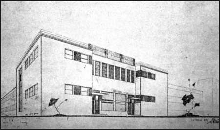 Главный фасад типового проекта гостиницы на 40 мест (автор проекта – арх. П.В. Помазанов) Источник: Ермоленко В. Д. Типовые проекты для малоэтажного строительства жилых домов и гостиниц // Коммунал. стр-во. 1940. № 5. С. 6.