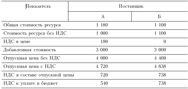 ? поставщик Б предлагает его по цене 1100 руб., но без НДС. Допустим, предприятие – потребитель данного материала, и добавленная стоимость (заработная плата, амортизация, прибыль и др.) составляет 3000 руб. на единицу продукции. Сопоставим приобретение производственного ресурса у этих двух поставщиков.