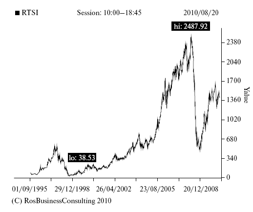Индекс РТС с момента расчета, когда его значение составляло 100, к июлю 2008 г. вырос почти в 25 раз, т. е. среднегодовой темп роста, рассчитанный как среднегеометрическая величина, составил более 28 %. Однако мировой финансовый кризис привел к резкому падению российского фондового рынка. Всего за несколько месяцев индекс РТС рухнул до 498 пунктов, т. е. почти в 5 раз от своего максимального значения. К октябрю 2011 г. индекс отыграл половину своего падения, однако до полного восстановления потребуется несколько лет.