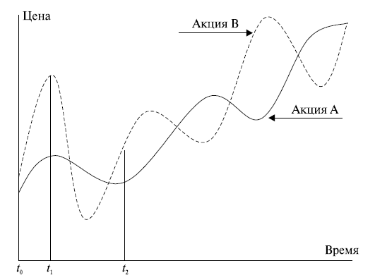 Таким образом, на длительном историческом отрезке акции в цене растут, что связано с общим ростом экономики. Однако рост курсовой стоимости акций происходит неравномерно, подъемы чередуются спадами. При этом волатильность акций различна. На условном примере (рис. 8.3) видим, что акции компании А и компании В за рассматриваемый период выросли в цене и принесли их владельцам одинаковый доход. Однако в отдельные периоды было снижение курсовой стоимости. Если инвестор купил акции в дату 1, а затем ему потребовались денежные средства, и он продал их в дату t, то он понес убыток, так как акции в цене упали. При этом убыток по акции В был больше, чем по акции А.