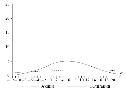 На рис. 8.5 представлен график нормального распределения показателей годовой доходности по акциям и облигациям за период с 1928 по 2008 г.