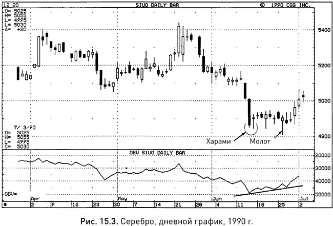 На рисунке 15.3 после резкого снижения, произошедшего 13 июня, появилась свеча с маленьким телом, и вместе с предыдущей черной свечой они образовали модель «харами». Выраженная нисходящая тенденция на две недели перешла в горизонтальную, в этот период значение OBV возрастало, отражая тем самым бычье накопление. В ходе торгов 25 июня были достигнуты новые минимумы, однако они не устояли, и на графике возник молот. Положительная дивергенция OBV, неудавшаяся попытка медведей удержать минимумы и образование молота сигнализировали о том, рынок достиг краткосрочного основания.