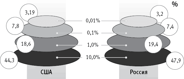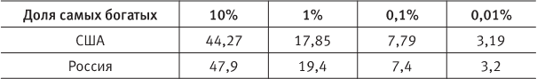 Статья Гуриева и Рачинского лишь описывает неравенство, но мало помогает в поисках объяснений. Естественный способ – сравнить нашу страну с той, где, во-первых, похожий уровень неравенства, а во-вторых, где эта область экономических исследований более развита. Бессмысленно сравнивать Россию со Швецией: там никогда не было такого расслоения; почти бессмысленно сравнение с Нигерией, потому что о нигерийском неравенстве известно еще меньше, чем о российском. Однако нужная страна есть. Таблица показывает удивительное сходство: в пределах самых богатых 10 % населения Москва чрезвычайно похожа на Америку.