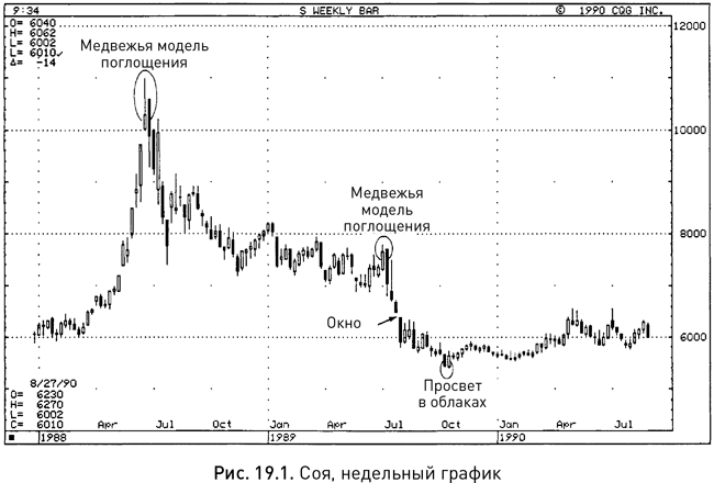 На рисунке 19.1 видно, что в 1988 г. на рынке сои произошел мощный подъем, в результате которого цены выросли почти вдвое – с $6 до $11. В верхней точке возникла медвежья модель поглощения – сигнал разворота на вершине, видимый только на свечном графике. По правилам западного технического анализа для получения такого сигнала требовалось, чтобы рынок за один и тот же временной интервал успел обновить максимум и опуститься ниже предыдущей цены закрытия, а в данном случае черная свеча медвежьей модели поглощения к обновлению максимума не привела. Для фермера, выращивающего сою, модель поглощения служила сигналом к открытию короткой хеджевой позиции либо к ее наращиванию, если ранее он уже защитил от обесценения часть будущего урожая.