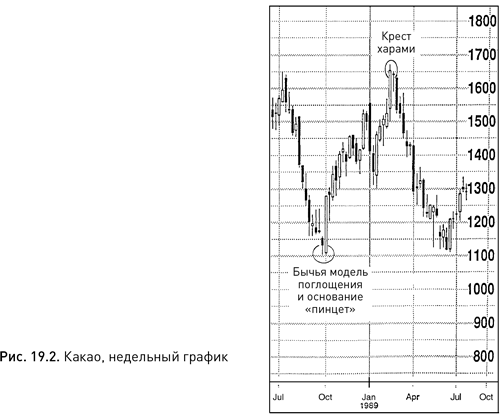 На рисунке 19.2 в последнюю сентябрьскую и первую октябрьскую недели 1988 г. возникло сразу несколько свечных сигналов, предупреждавших о росте. Самым ярким из них была бычья модель поглощения, но одновременно с ней сформировалось еще и основание «пинцет», белая свеча которого, к тому же, оказалась бычьим захватом за пояс и поглотила предыдущие пять свечей. В этот период тем, кто опасался подъема цен, следовало открывать длинные хеджевые позиции или наращивать их объем. В начале 1989 г., после появления важного сигнала разворота – креста харами, – эти позиции следовало сокращать. Особую значимость кресту харами придавало то, что он состоял из длинной белой свечи и дожи, а, как отмечалось в главе 8, такая комбинация часто служит признаком достижения вершины.