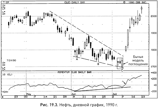 В июле 1990 г. хеджеры, желающие защититься от повышения цены на нефть, с помощью свечного анализа могли распознать ранние признаки разворота в основании (см. рис. 19.3). Предварительный сигнал разворота поступил 5 июля в виде молота, однако поскольку тот возник после гэпа вниз относительно предыдущих минимумов, бычьим его можно было считать лишь при наличии какого-либо подтверждающего индикатора. Таковым оказалась бычья модель поглощения, которая, к тому же, сама по себе являлась чрезвычайно важным сигналом разворота, учитывая, что ее белая свеча от 9 июля поглотила не одно, а сразу два черных тела. Уже на данном этапе покупателям сырой нефти следовало всерьез задуматься об открытии или наращивании длинной хеджевой позиции.