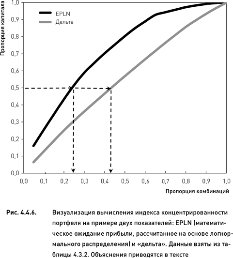 На рис. 4.4.6 показаны две функции кумулятивной пропорции, соответствующие показателям «математическое ожидание прибыли» и «дельта» (данные взяты из таблицы 4.3.2). Используя эти функции, можно рассчитать, в каком проценте комбинаций (от общего числа комбинаций в портфеле) сосредоточено 50 % капитала. Это и будет значением индекса концентрированности портфеля. Для показателя «математическое ожидание прибыли» индекс равен 0,25, а для дельты он равен приблизительно 0,42. Это означает, что при распределении капитала по матожиданию прибыли 50 % капитала оказалось вложенным в 25 % комбинаций, а при формировании портфеля по показателю дельты половина капитала была вложена в 42 % комбинаций. Следовательно, в данном примере использование показателя «математическое ожидание прибыли» приводит к более концентрированному распределению капитала и, соответственно, созданию менее диверсифицированного портфеля.