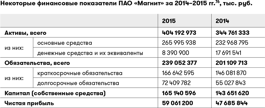 Мы видим, что активы компании почти вдвое превышают ее обязательства. Это хороший экономический показатель. Капитал (собственные средства) ПАО «Магнит» представляет собой солидную сумму в 165,14 млрд руб. Компания прибыльная. В 2015 г. ее чистая прибыль составила более 59 млрд руб., что на 23 % выше, чем в 2014 г. Если мы ознакомимся на сайте компании с общей информацией о ее деятельности, например о количестве новых магазинов и гипермаркетов «Магнит», открываемых каждый год, то поймем, что это очень хорошая, динамично развивающаяся компания. За надежность ее акций можно не волноваться.
