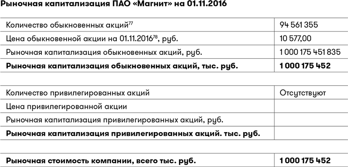 Капитализация компании, то есть рыночная стоимость всех ее акций, по состоянию на 1 ноября 2016 г. составила 1 000 175 452 тыс. руб.